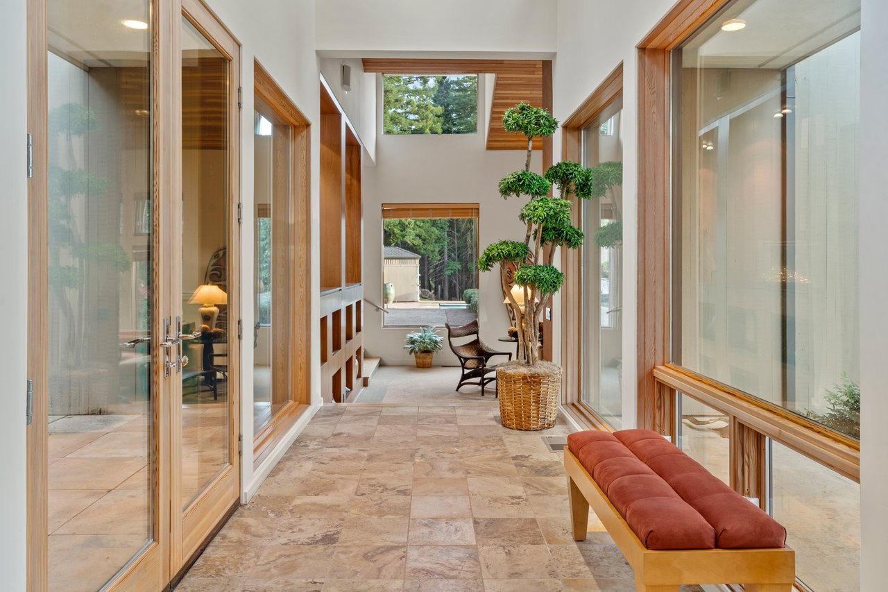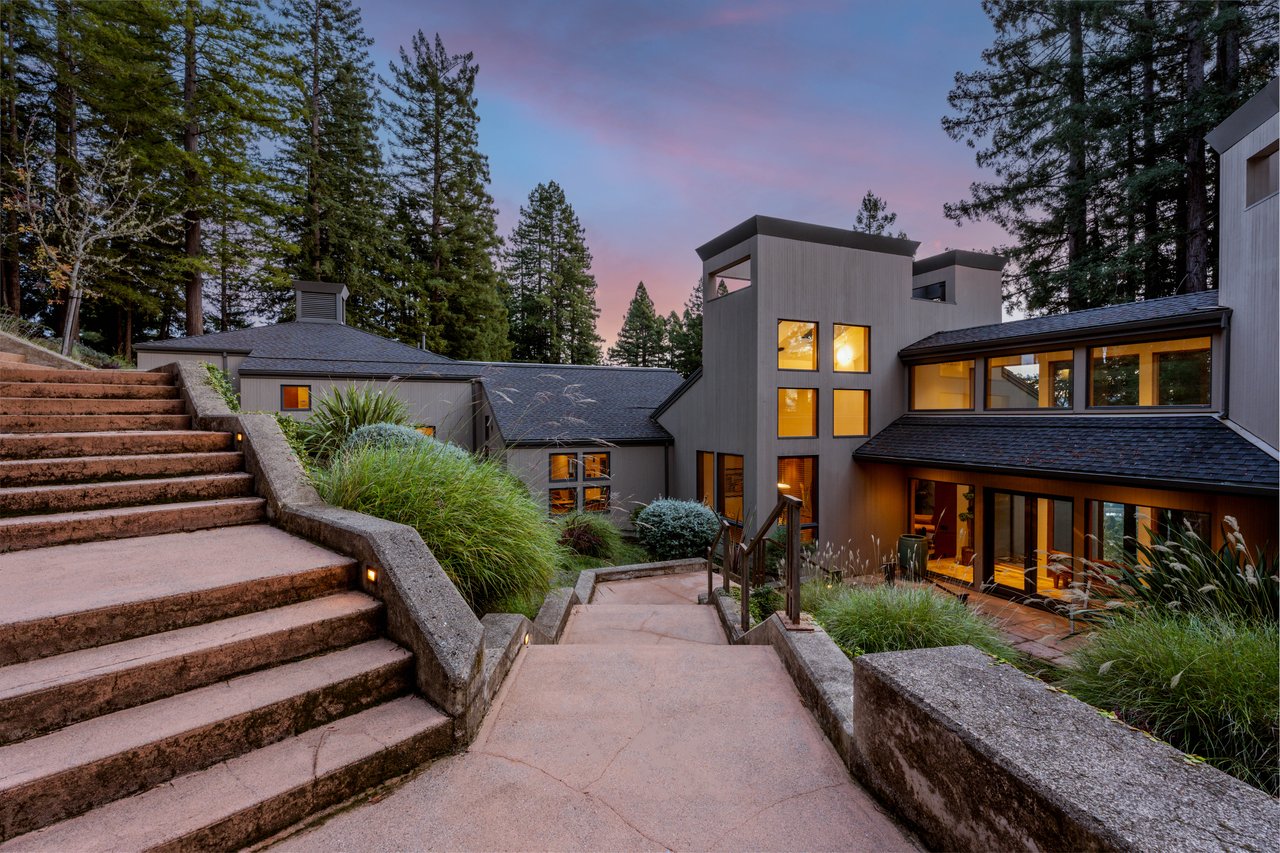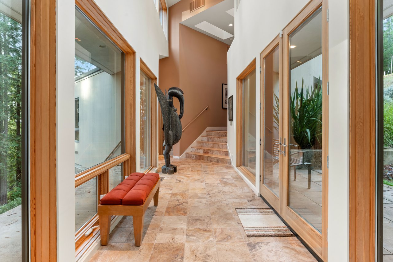 The approximately 3,000 sq. ft. residence is a contemporary retreat, thoughtfully terraced into the hillside to harmonize with its surroundings. A dramatic glass entry corridor and expansive window walls create the sensation of living suspended in the redwood canopy—an elevated, modern treehouse experience.