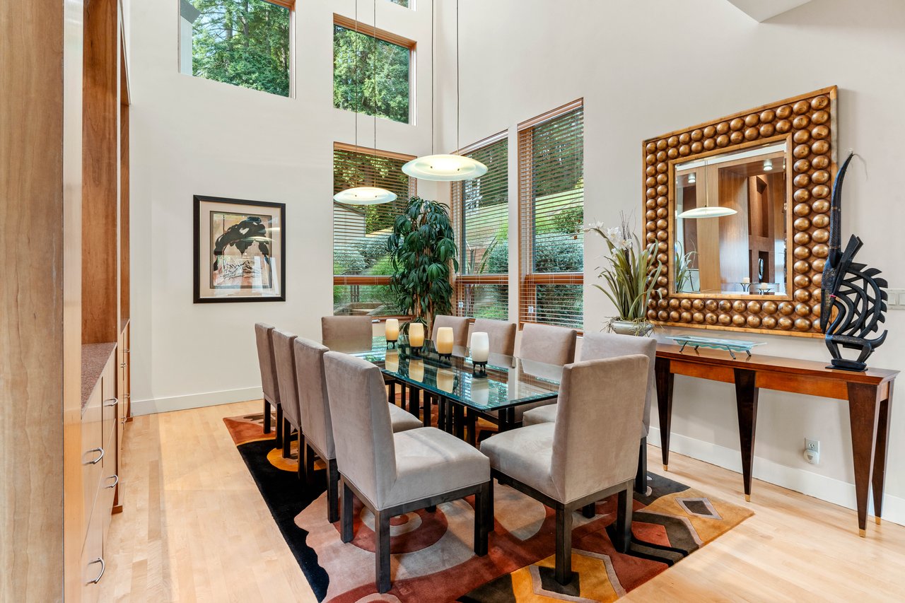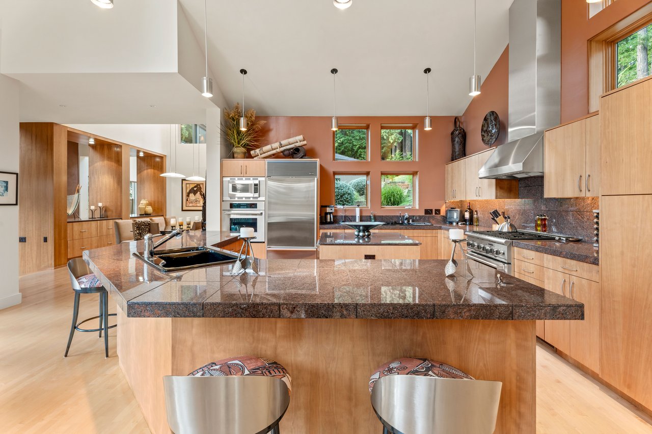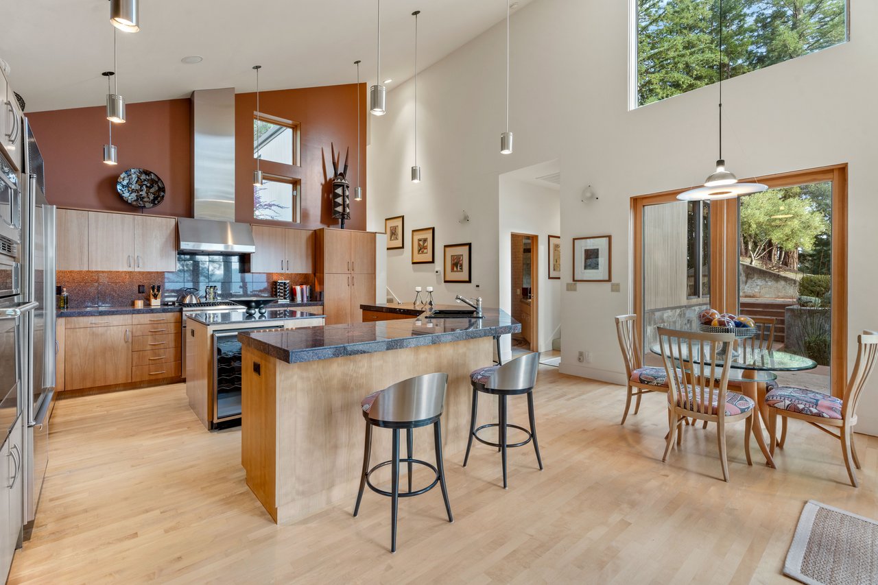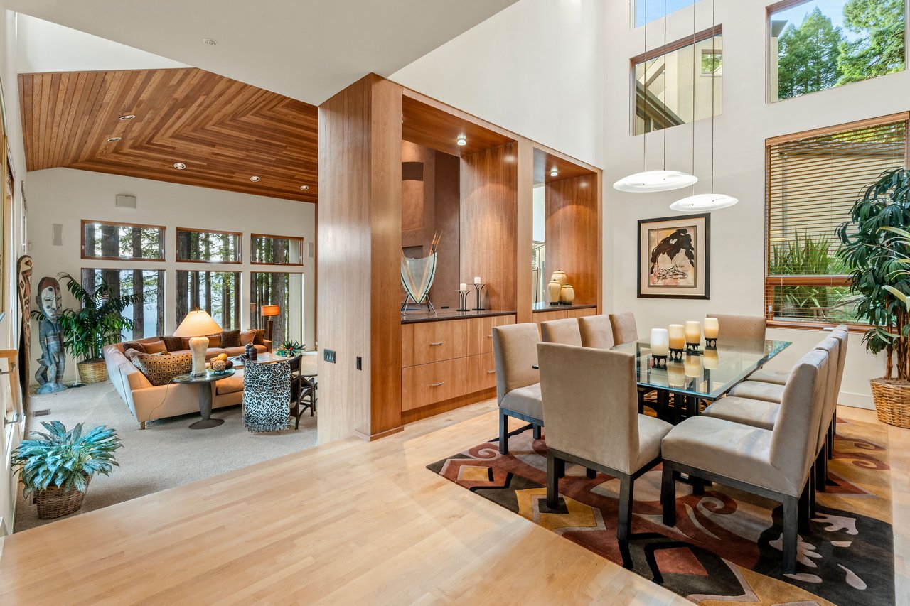 The approximately 3,000 sq. ft. residence is a contemporary retreat, thoughtfully terraced into the hillside to harmonize with its surroundings. A dramatic glass entry corridor and expansive window walls create the sensation of living suspended in the redwood canopy—an elevated, modern treehouse experience.