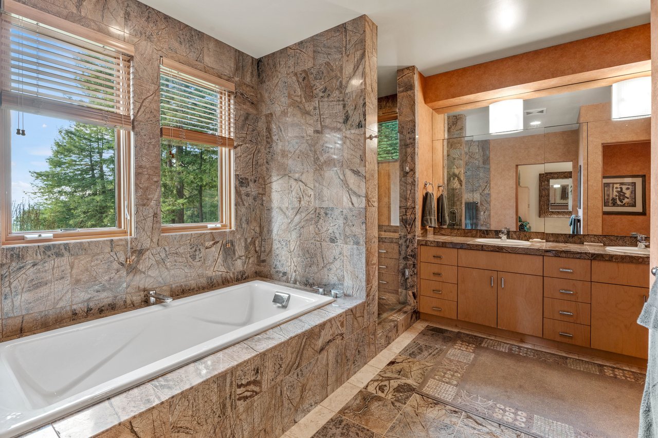 The home offers 3 bedrooms and 3 baths, including a generous primary suite with an en-suite spa-like bathroom. High-end design elements, impeccable craftsmanship, and custom finishes appear throughout. The chef’s kitchen features premium appliances, while the elevated formal dining area overlooks a light-filled living room which frames the forest and valley beyond. A two-car garage provides practical, secure storage and parking for vehicles.