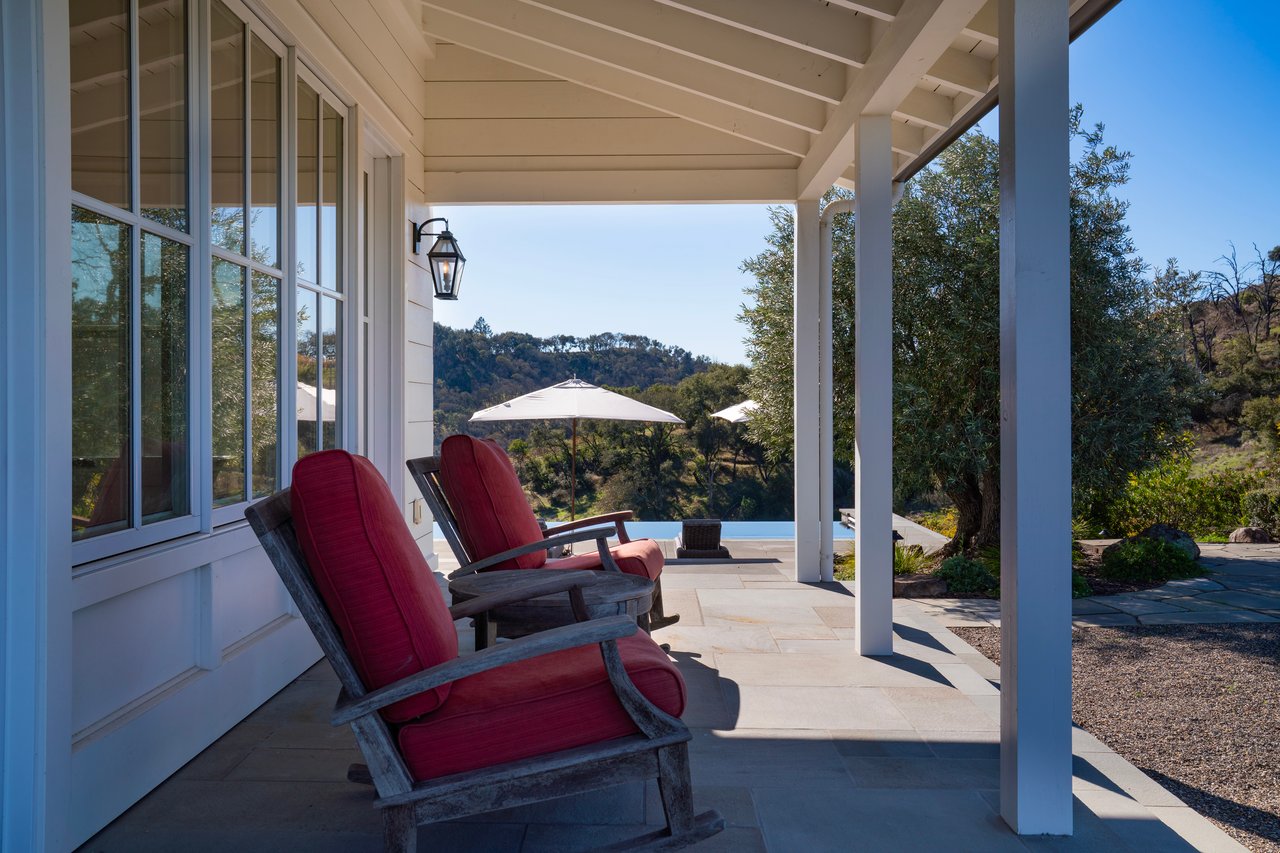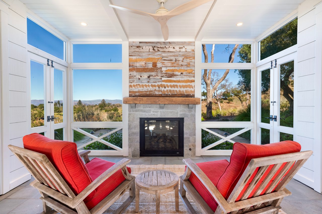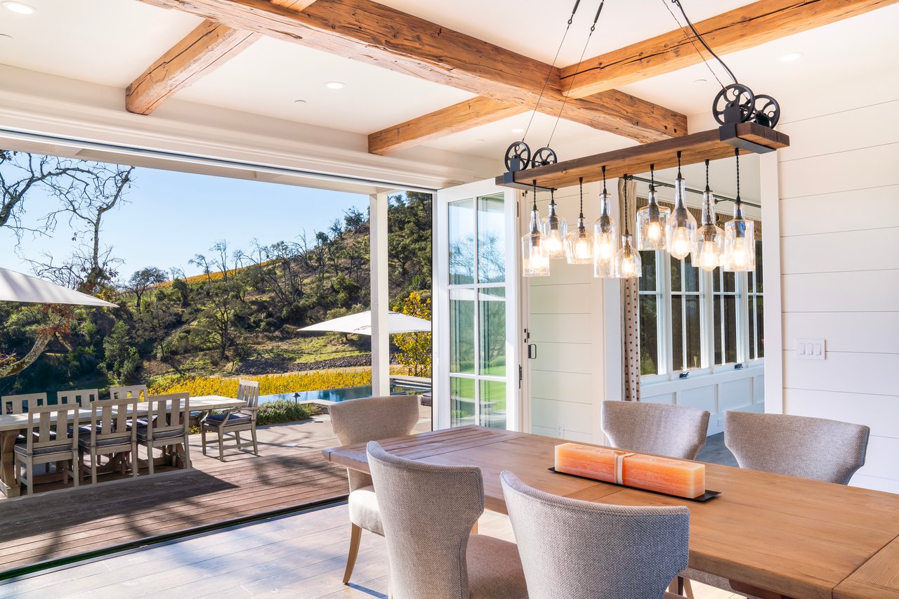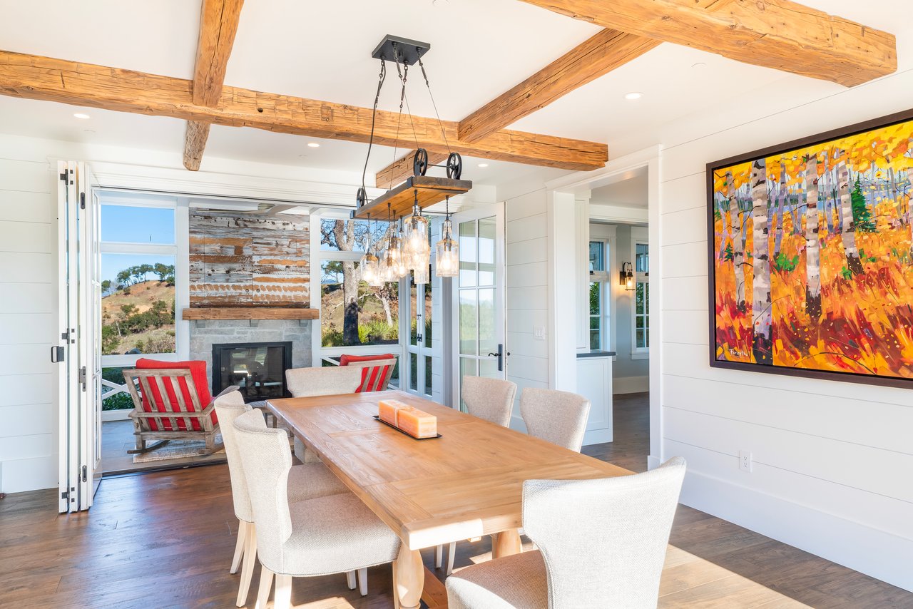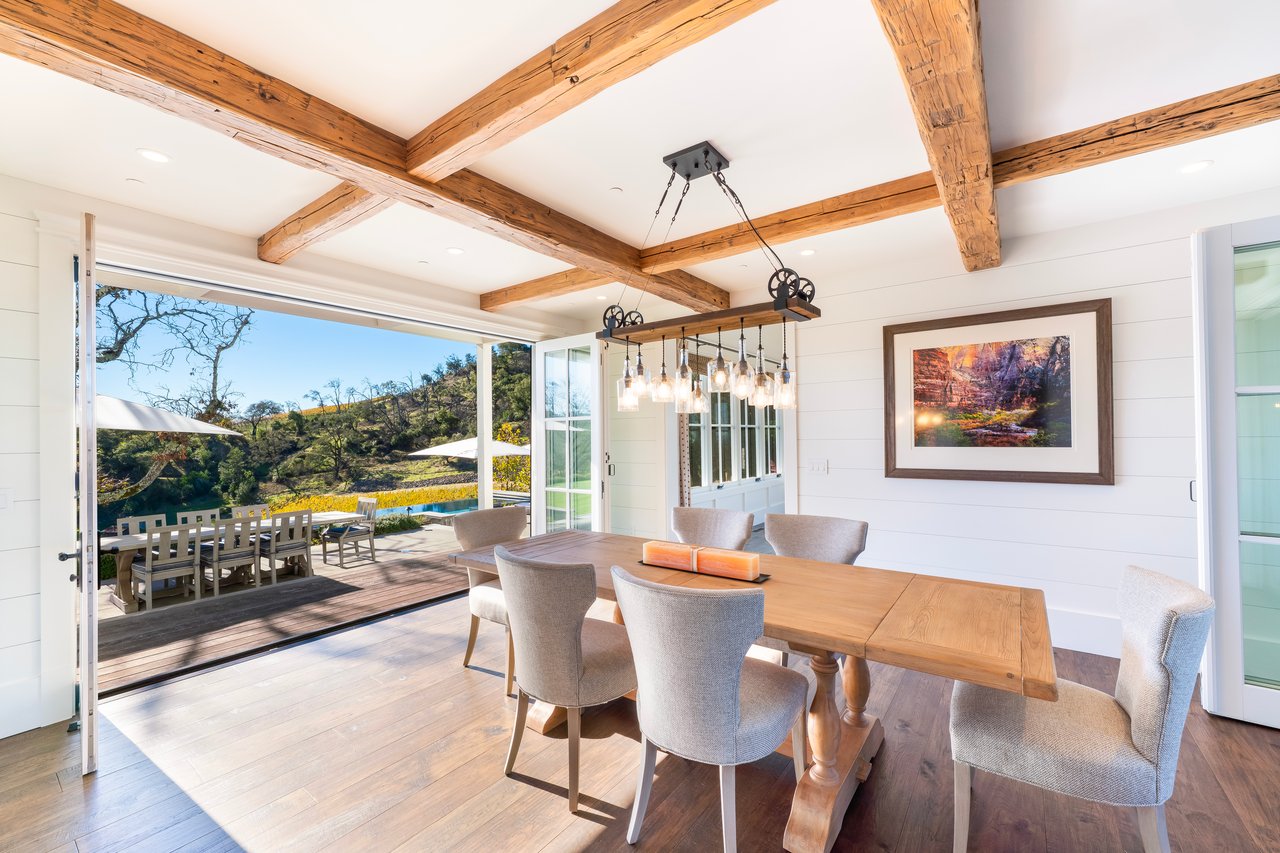 The estate is anchored by a thoughtfully crafted 4,288± sq. ft. residence, designed and constructed by Total Concepts, a bespoke wine country builder known for exceptional custom homes. With refined farmhouse sensibility, the design blends warmth, authenticity, and understated luxury. The formal living room, defined by its vaulted ceilings and sweeping views, flows naturally into the formal dining room, where exposed ceiling beams add architectural character. Folding glass doors extend the dining room to outdoor living areas and to a cozy screened porch with a warming fireplace, creating an inviting, year-round indoor–outdoor experience.