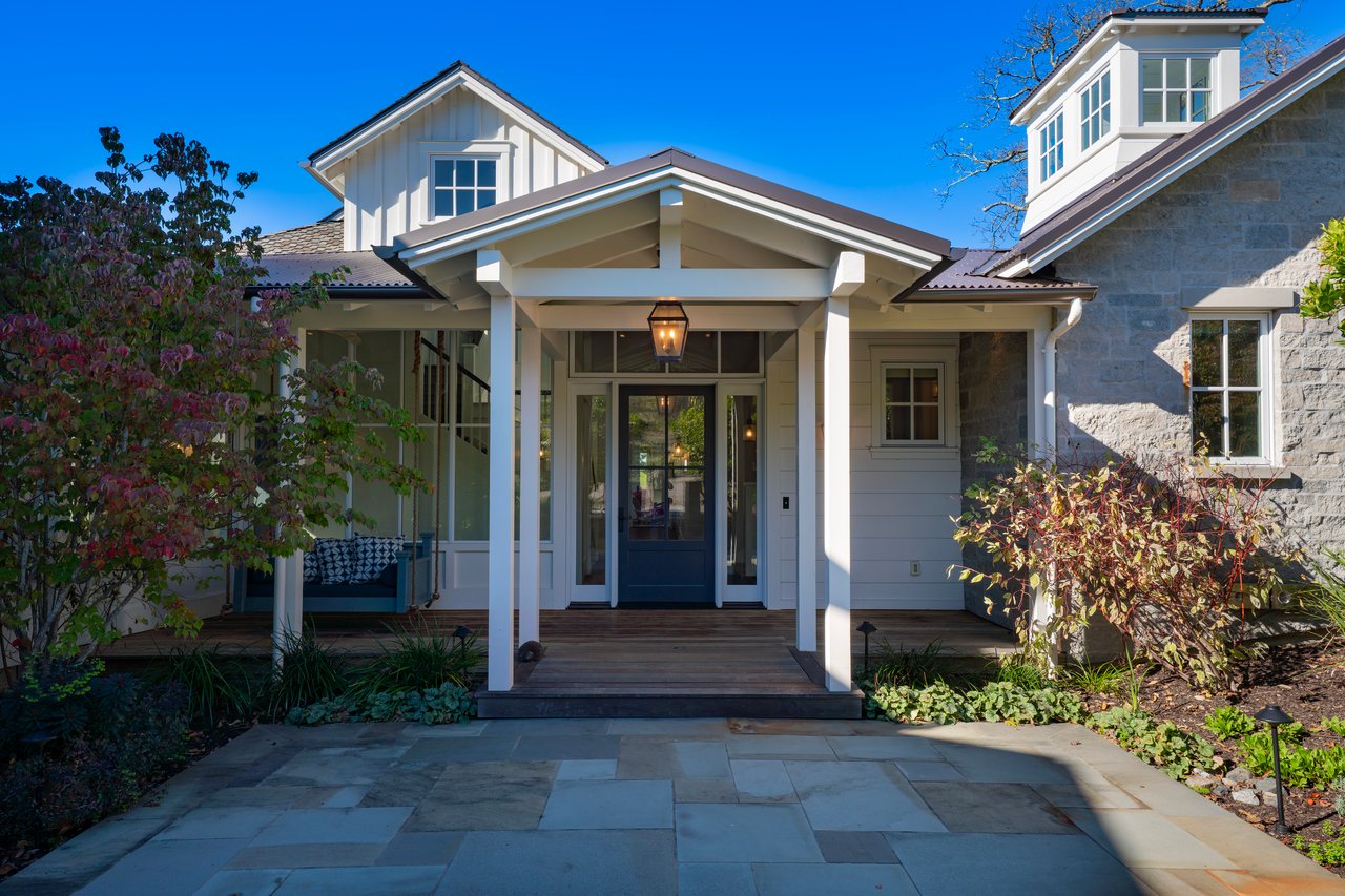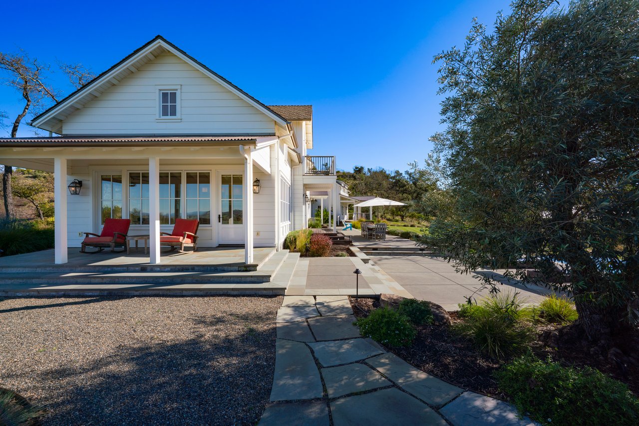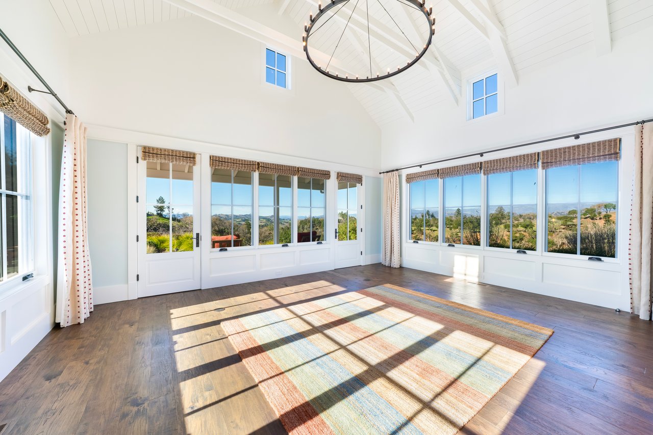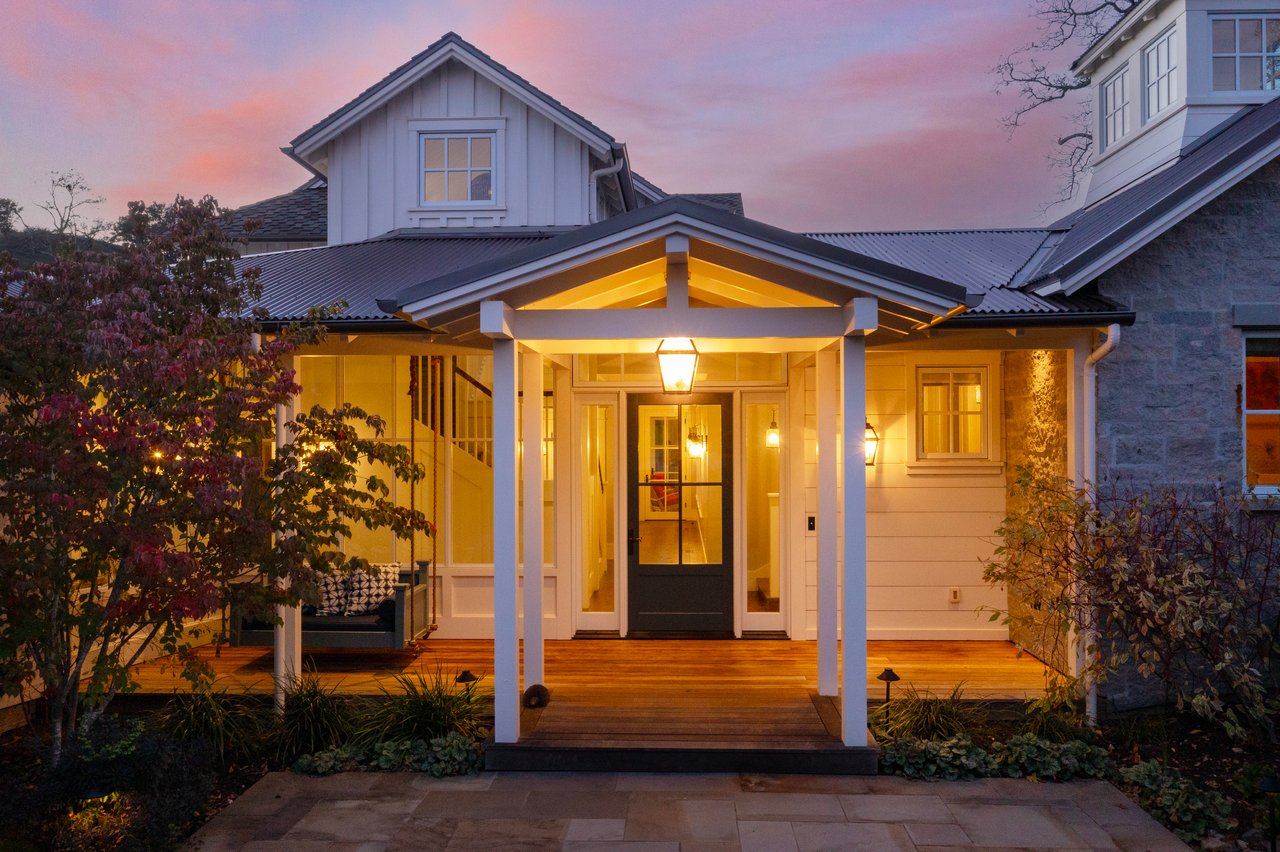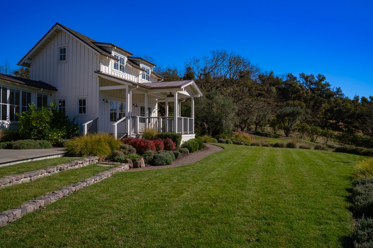 The estate is anchored by a thoughtfully crafted 4,288± sq. ft. residence, designed and constructed by Total Concepts, a bespoke wine country builder known for exceptional custom homes. With refined farmhouse sensibility, the design blends warmth, authenticity, and understated luxury. The formal living room, defined by its vaulted ceilings and sweeping views, flows naturally into the formal dining room, where exposed ceiling beams add architectural character. Folding glass doors extend the dining room to outdoor living areas and to a cozy screened porch with a warming fireplace, creating an inviting, year-round indoor–outdoor experience.