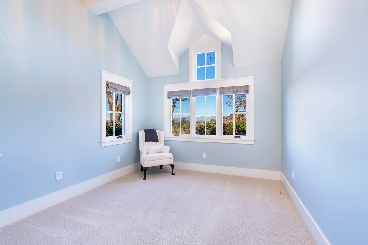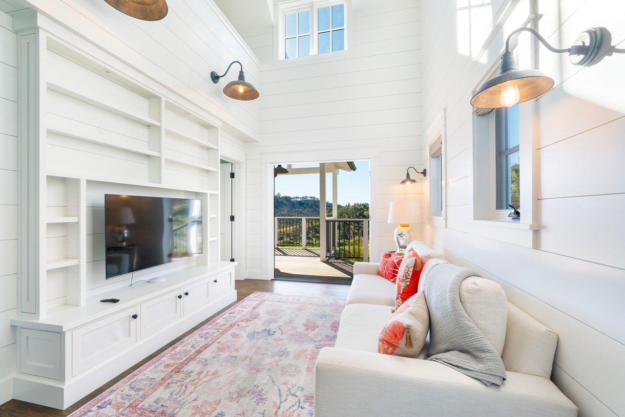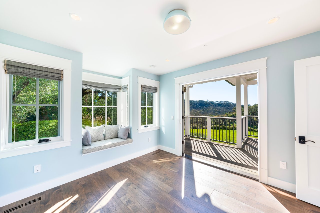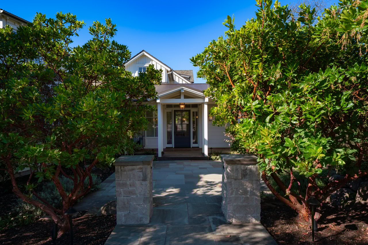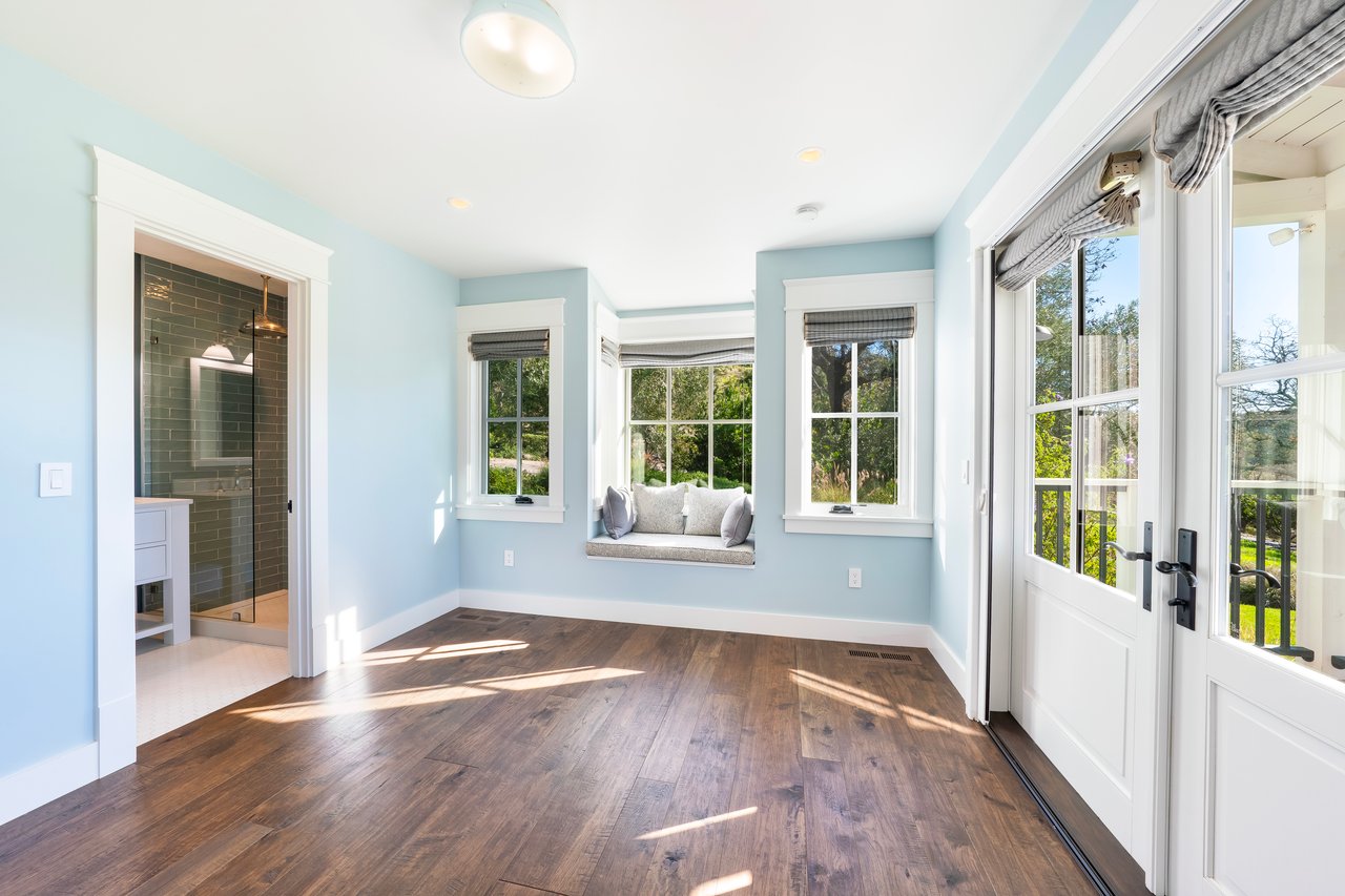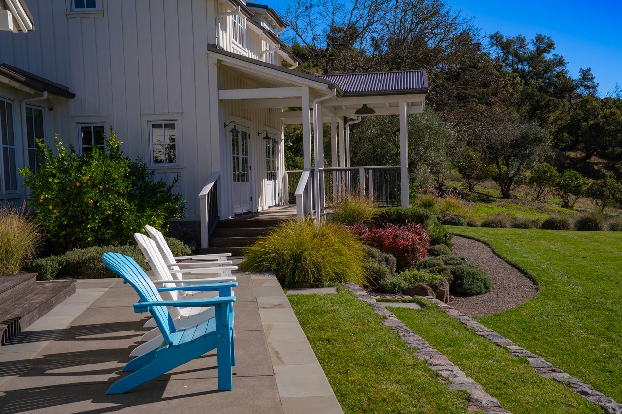 The estate is anchored by a thoughtfully crafted 4,288± sq. ft. residence, designed and constructed by Total Concepts, a bespoke wine country builder known for exceptional custom homes. With refined farmhouse sensibility, the design blends warmth, authenticity, and understated luxury. The formal living room, defined by its vaulted ceilings and sweeping views, flows naturally into the formal dining room, where exposed ceiling beams add architectural character. Folding glass doors extend the dining room to outdoor living areas and to a cozy screened porch with a warming fireplace, creating an inviting, year-round indoor–outdoor experience.