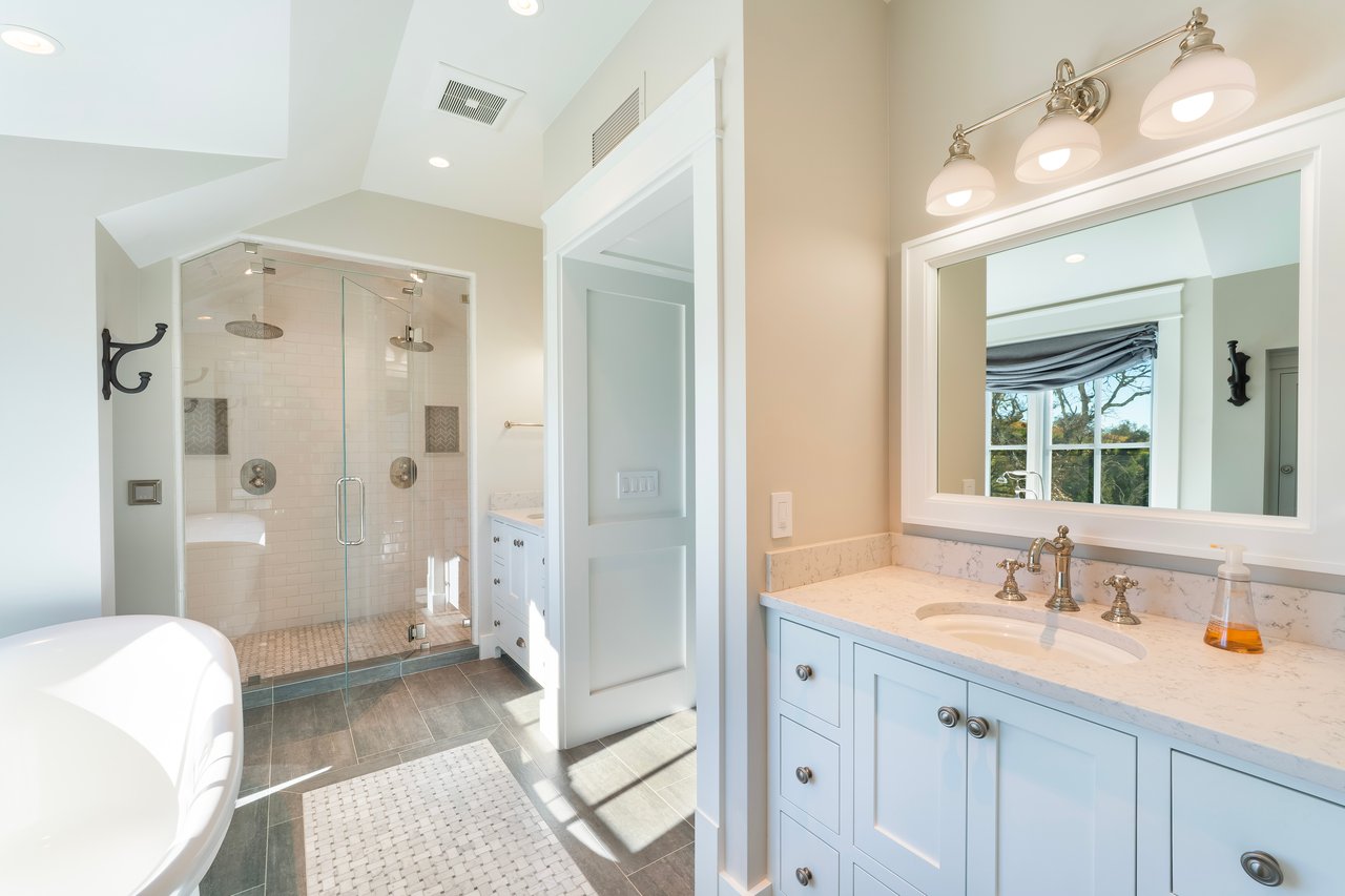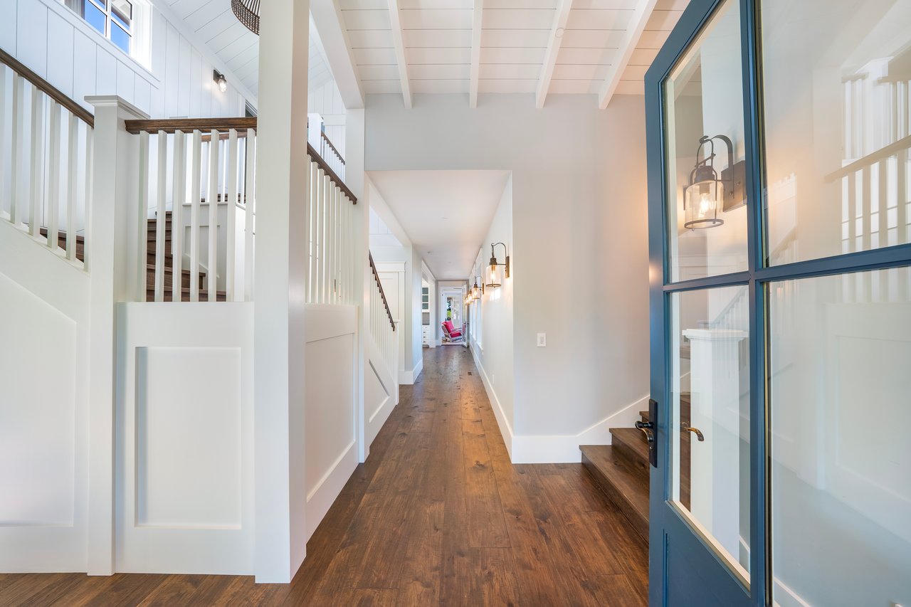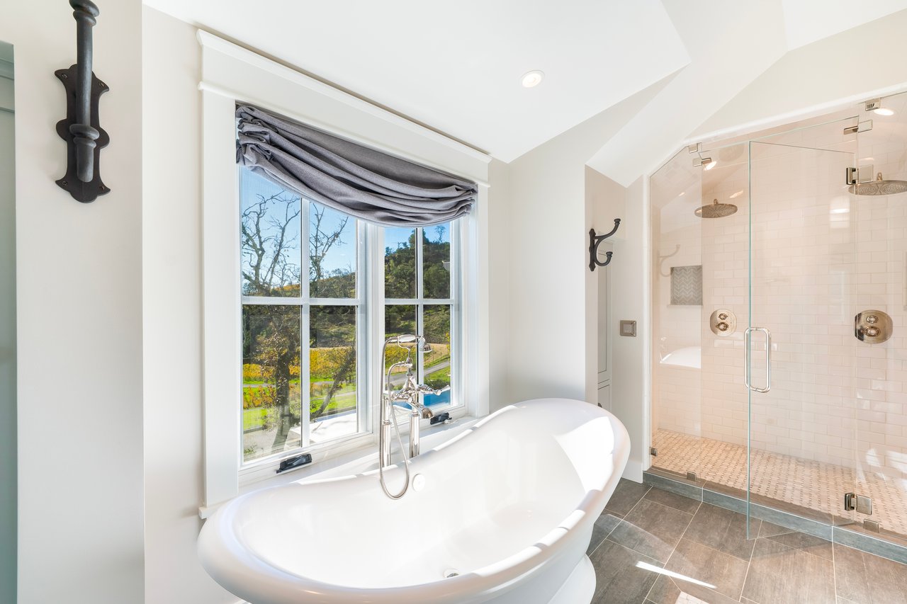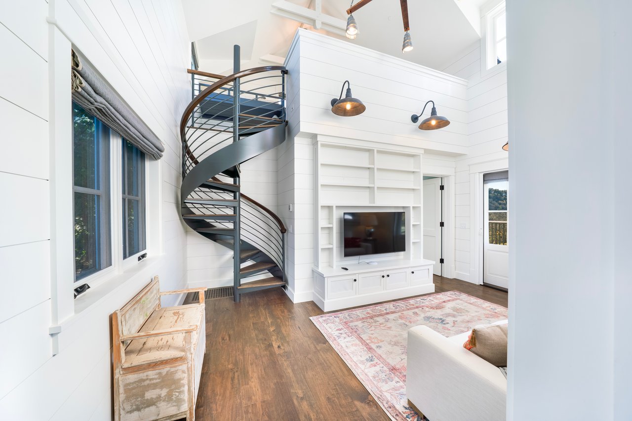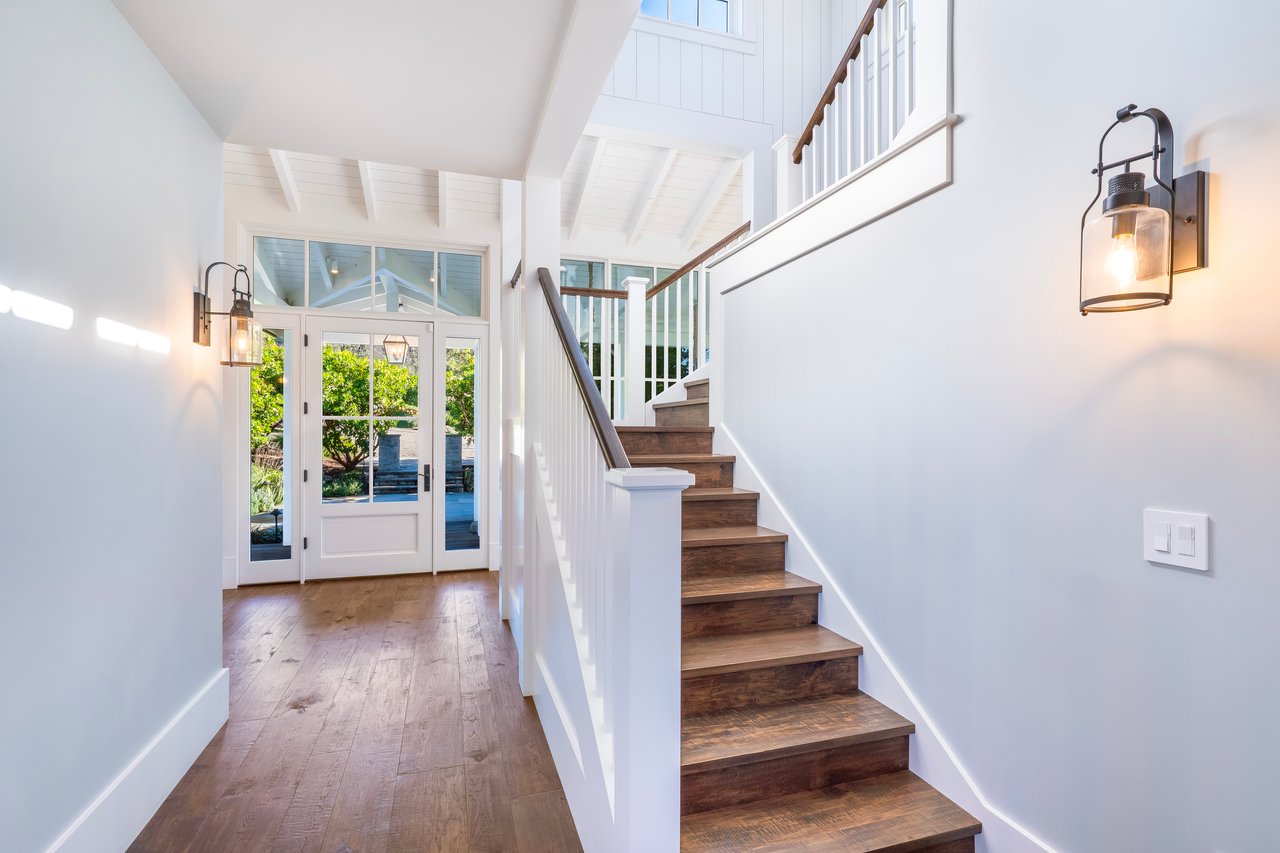 The estate is anchored by a thoughtfully crafted 4,288± sq. ft. residence, designed and constructed by Total Concepts, a bespoke wine country builder known for exceptional custom homes. With refined farmhouse sensibility, the design blends warmth, authenticity, and understated luxury. The formal living room, defined by its vaulted ceilings and sweeping views, flows naturally into the formal dining room, where exposed ceiling beams add architectural character. Folding glass doors extend the dining room to outdoor living areas and to a cozy screened porch with a warming fireplace, creating an inviting, year-round indoor–outdoor experience.