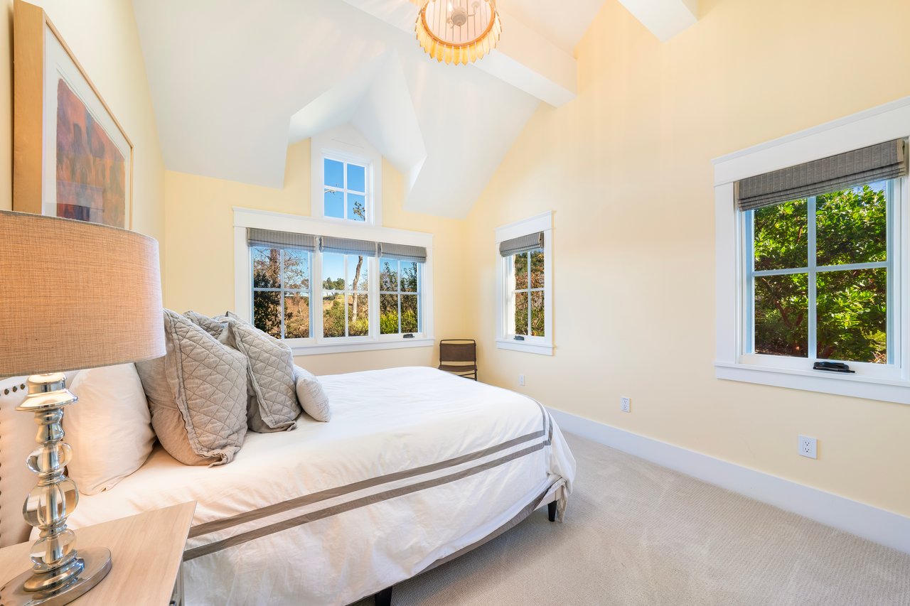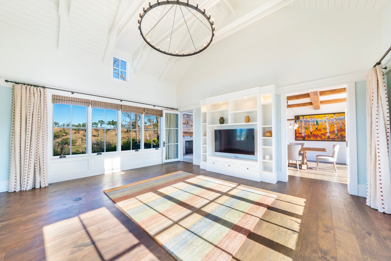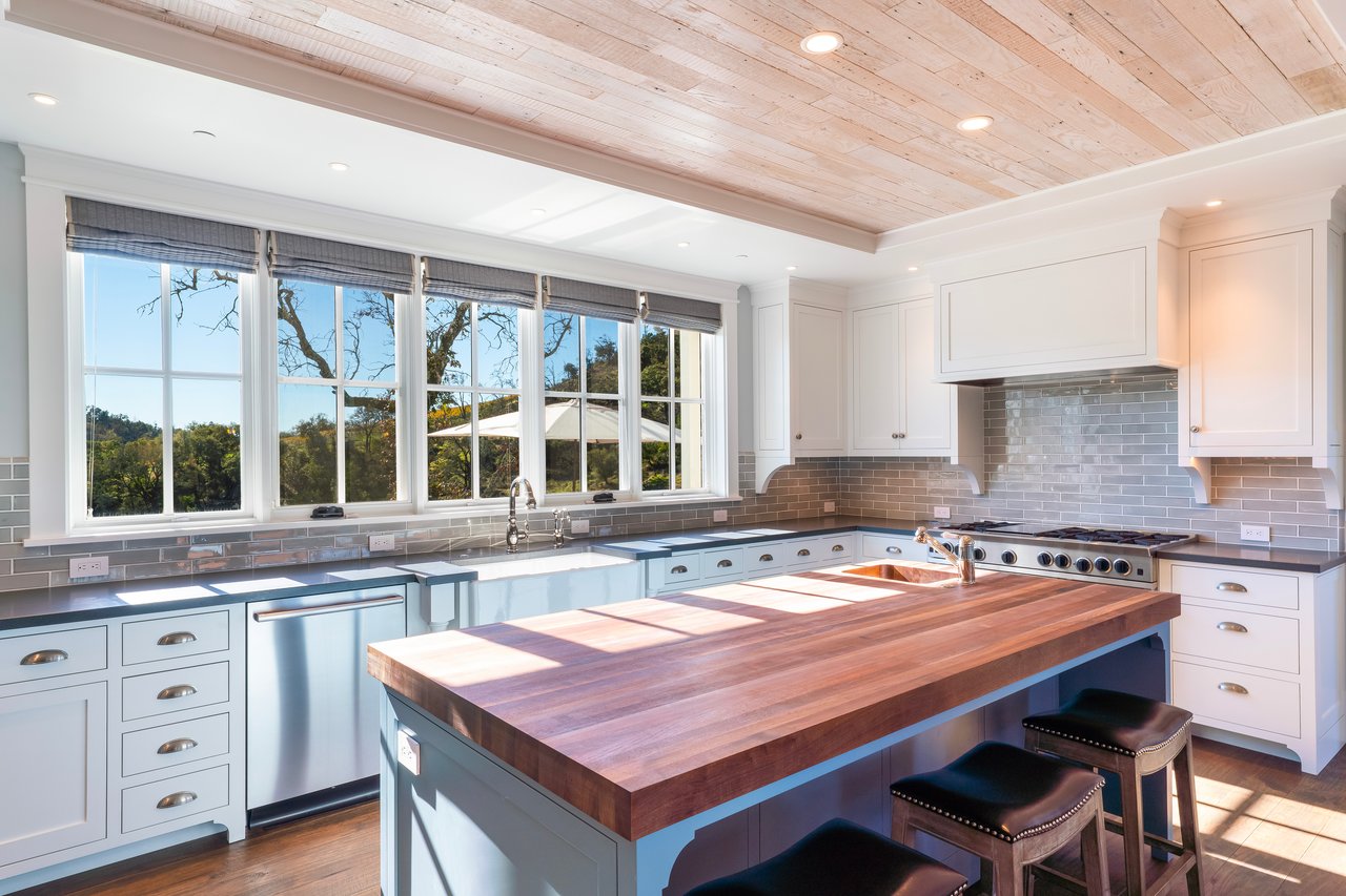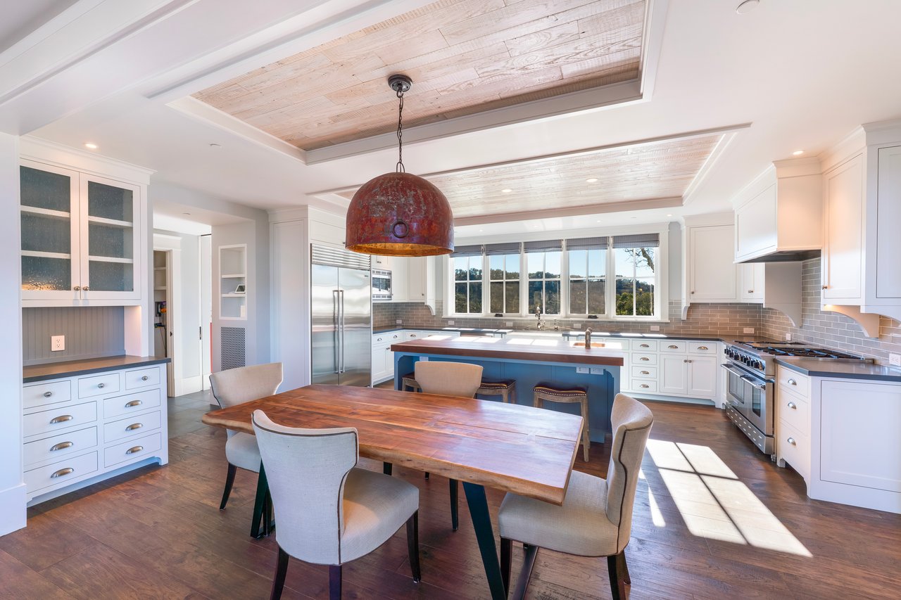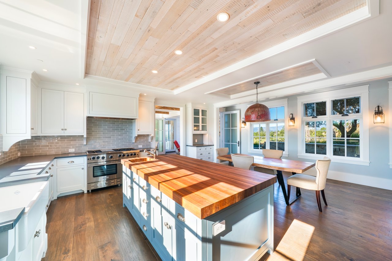 The adjoining kitchen is both functional and beautifully executed, featuring a sizable island with a butcher block countertop, built-in Sub-Zero refrigeration, a BlueStar six-burner range with griddle, a walk-in pantry, and abundant windows that frame views and connect the space to the surrounding landscape.
