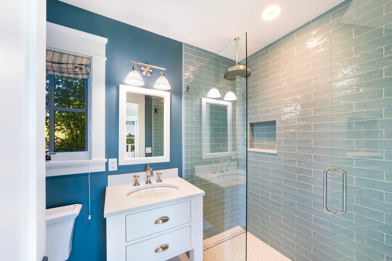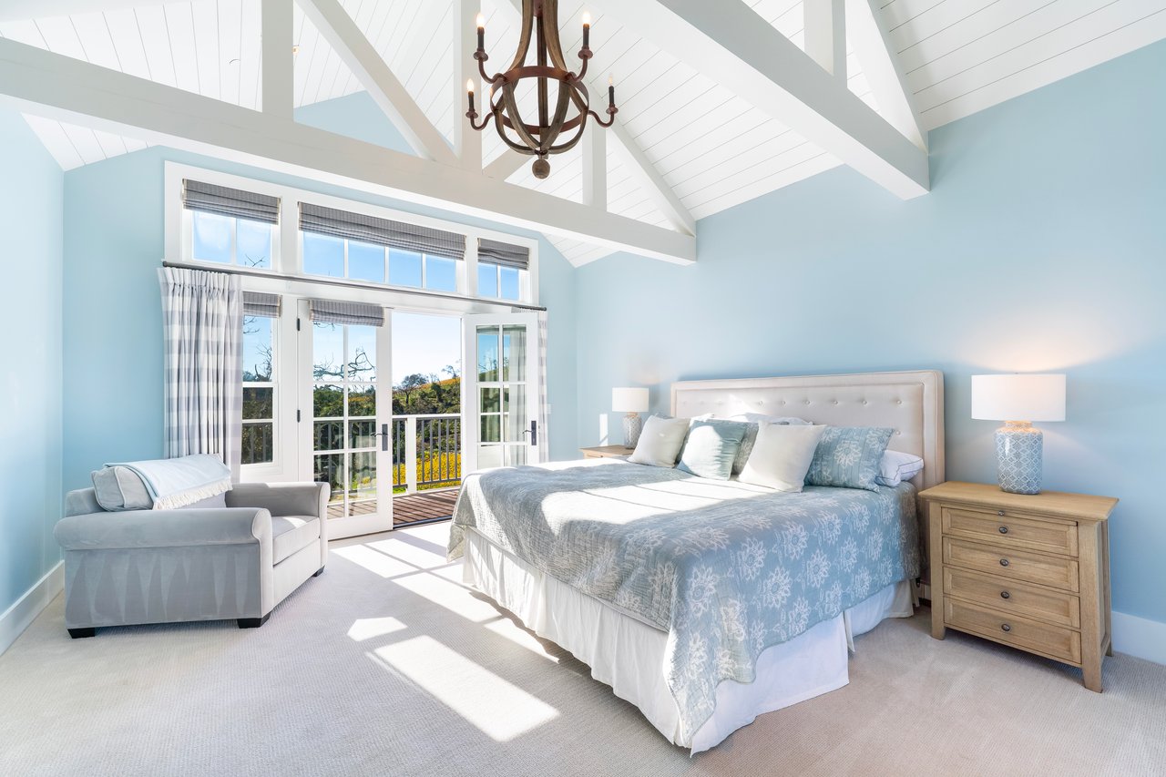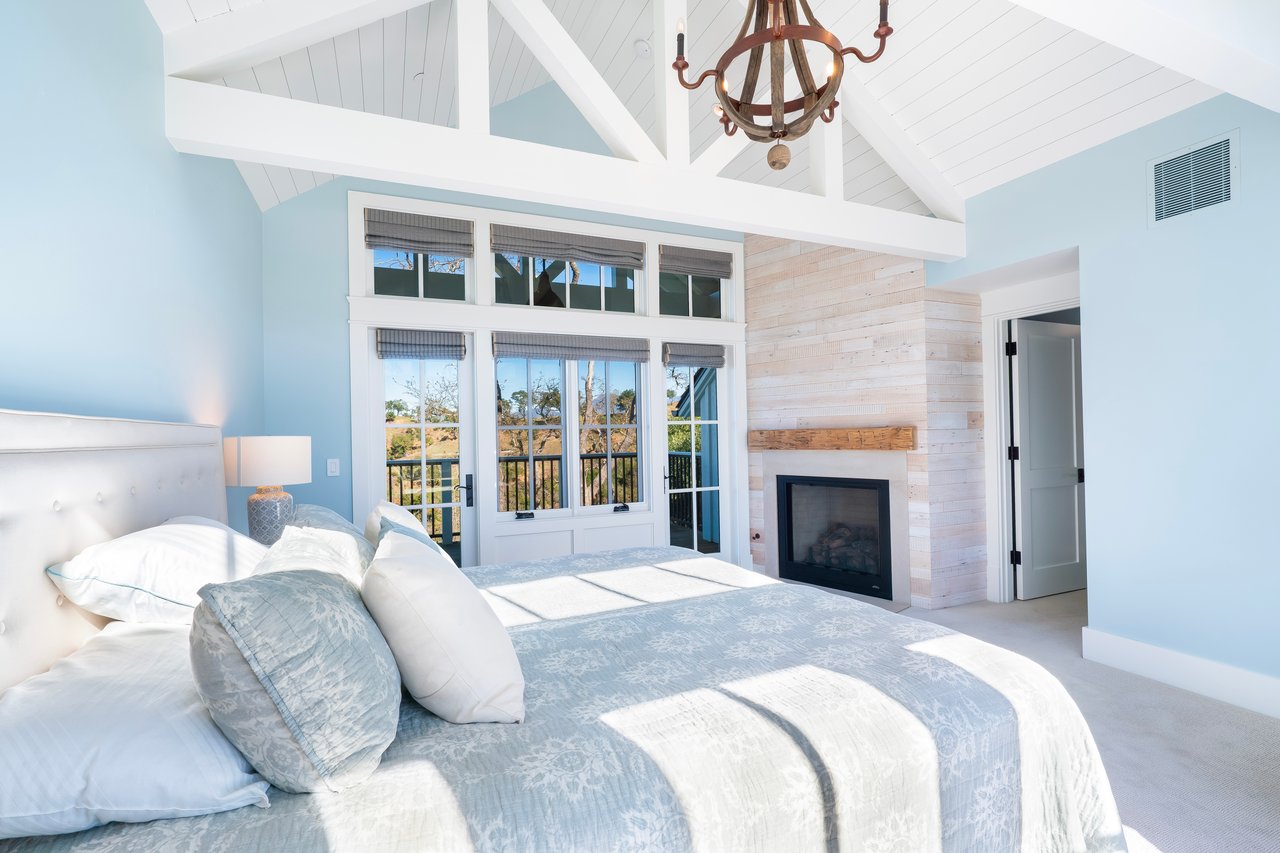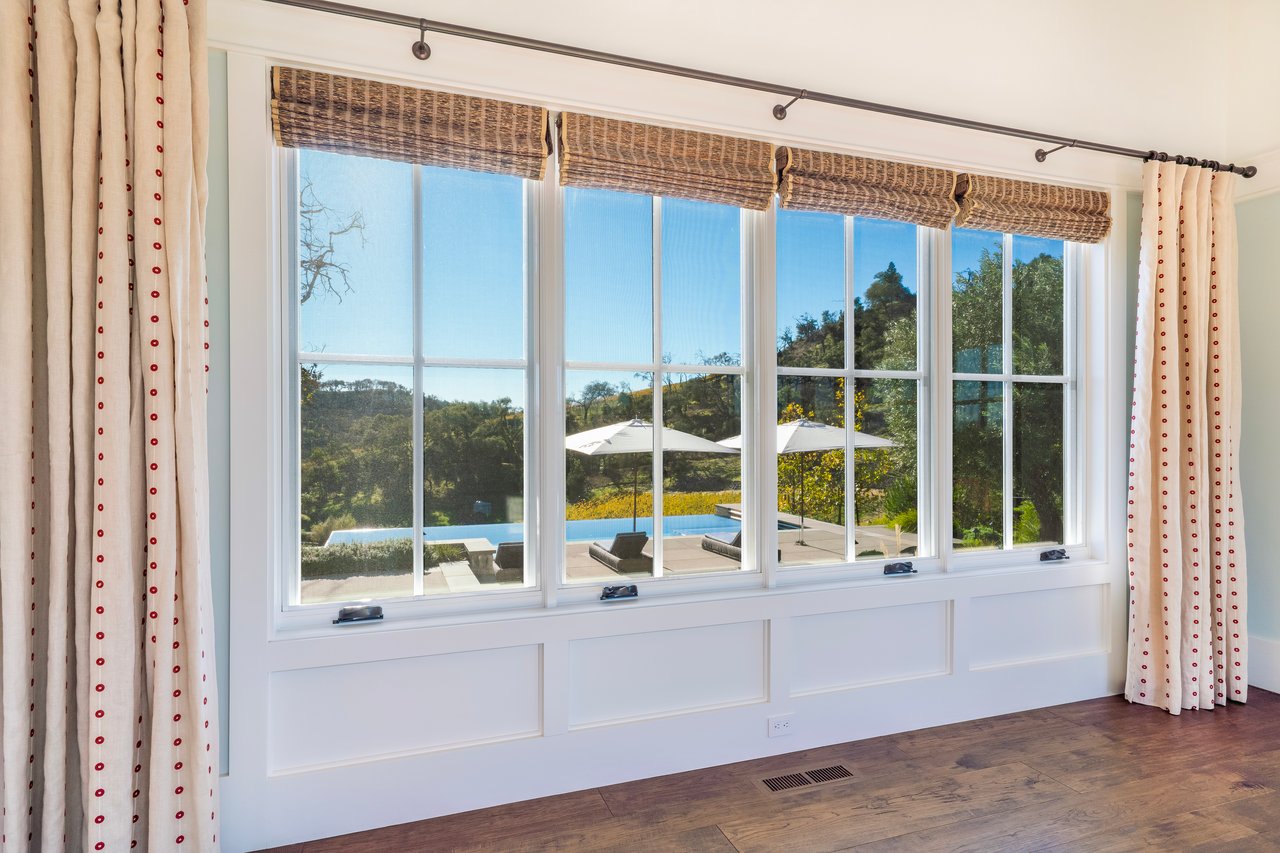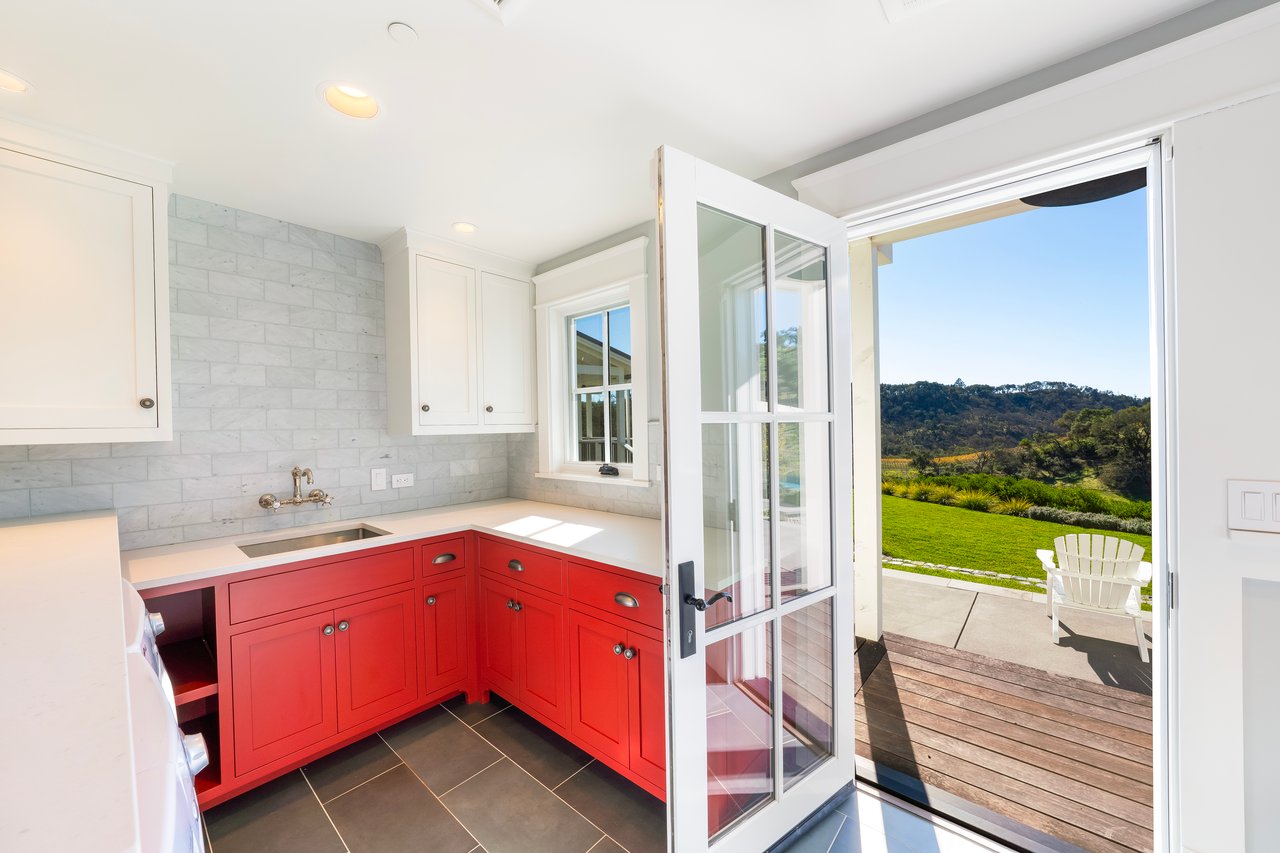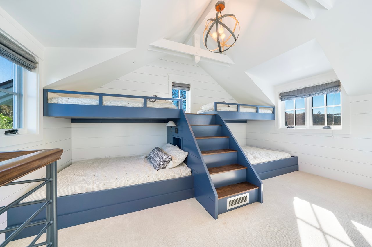The adjoining kitchen is both functional and beautifully executed, featuring a sizable island with a butcher block countertop, built-in Sub-Zero refrigeration, a BlueStar six-burner range with griddle, a walk-in pantry, and abundant windows that frame views and connect the space to the surrounding landscape.