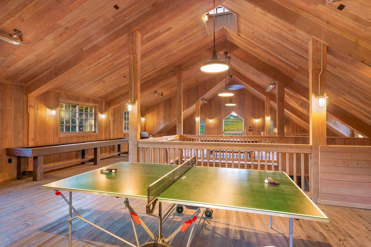 Nestled alongside the estate’s vineyard and sweeping meadows, beneath heritage oaks, the distinctive party barn blends scale and artistry, with robust beams and natural materials setting the stage for a car collection, studio or workshop, or thoughtfully curated event.